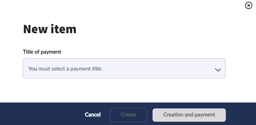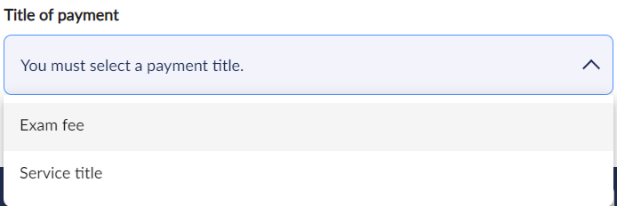 In the Overview and To be paid menus, the first step after clicking the New item button is to select the title of payment. The title can either be Exam fee or Service fee. In the Exam registration menu, only Exam fee titled items can be transcribed.