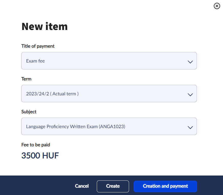 If the student has set everything up correctly, they have two options to complete the transcription. By clicking on the Create button, the item will be created and will be found in the To be paid menu, but the payment will not yet be completed. By clicking on the Create and payment button, the program will offer the Payment methods window and the student can immediately pay the item, which can then be viewed in the Paid in items menu.