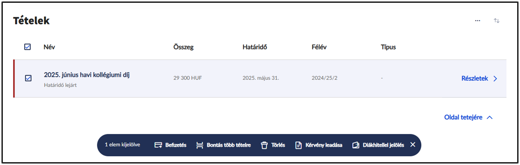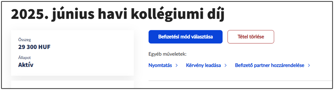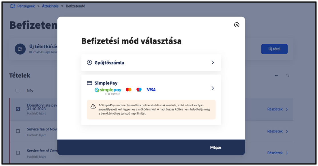 A Pénzügyek Befizetendő menüpontban a befizetéshez ki kell jelölnie a befizetésre váró tételt és az alul megjelenő szövegdobozban a Befizetésre vagy a Részletek megnyitásával a Befizetési mód választása gombra kell kattintania.