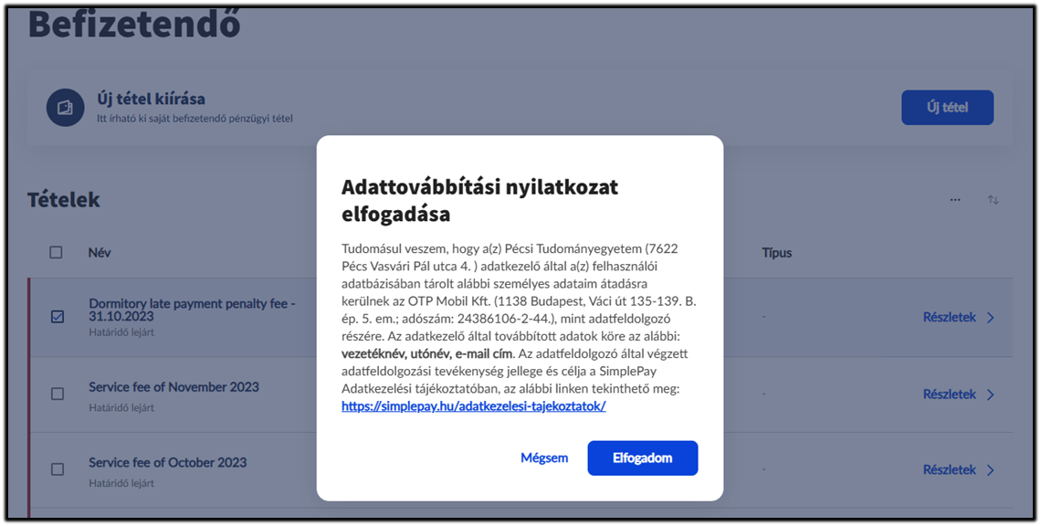 Ezután válassza ki a SimplePay befizetési típust, majd fogadja el az adattovábbítási nyilatkozatot.