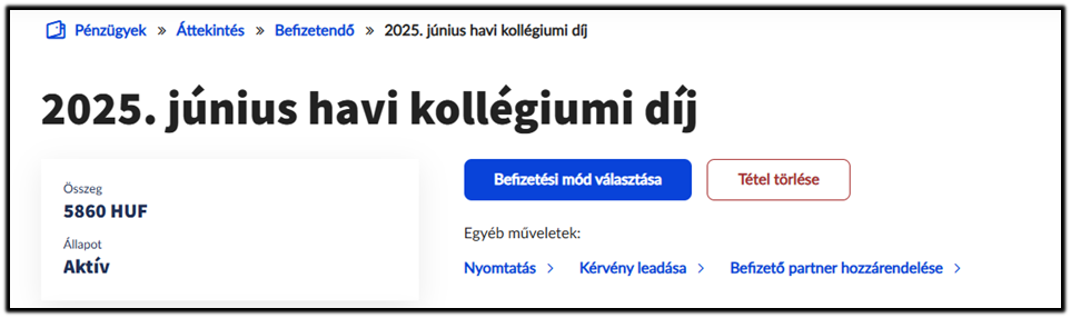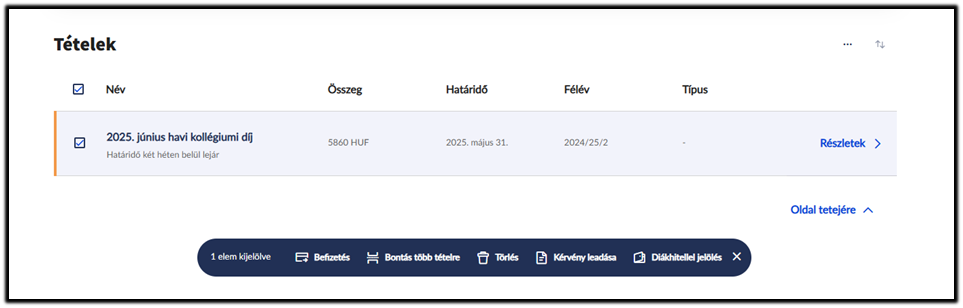 A Pénzügyek/Befizetendő menüpontban a megfelelő soron állva a sor végén levő Részletek gombra kattintva érhető el a „Kérvény leadása” lehetőség vagy a befizetendő tételt kiválasztva a lap alján felugró szövegdobozban is rákattintható.