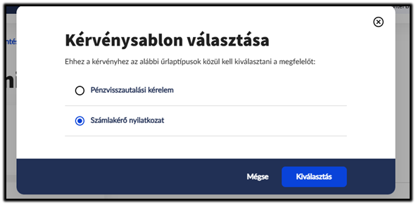 A kérvény leadása menüre kattintva ki kell választani a számlakérő nyilatkozat kérvénysablont.