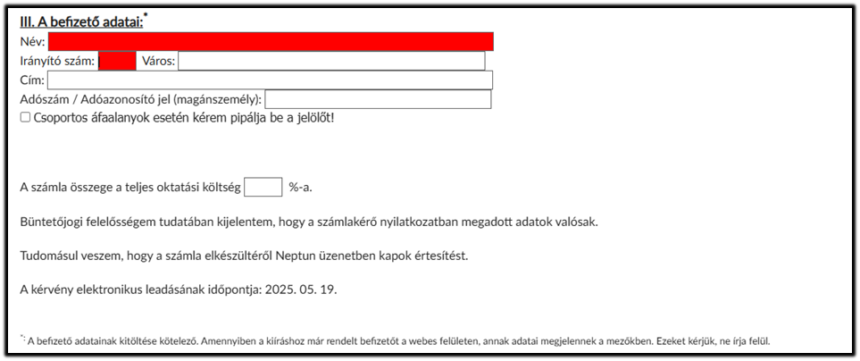 Lejárt tartozás és késedelmi díj fizetési kötelezettség elkerülése érdekében kérjük, hogy számlaigényét időben, legalább tíz nappal a Neptunban szereplő fizetési határidőt megelőzően jelezze.