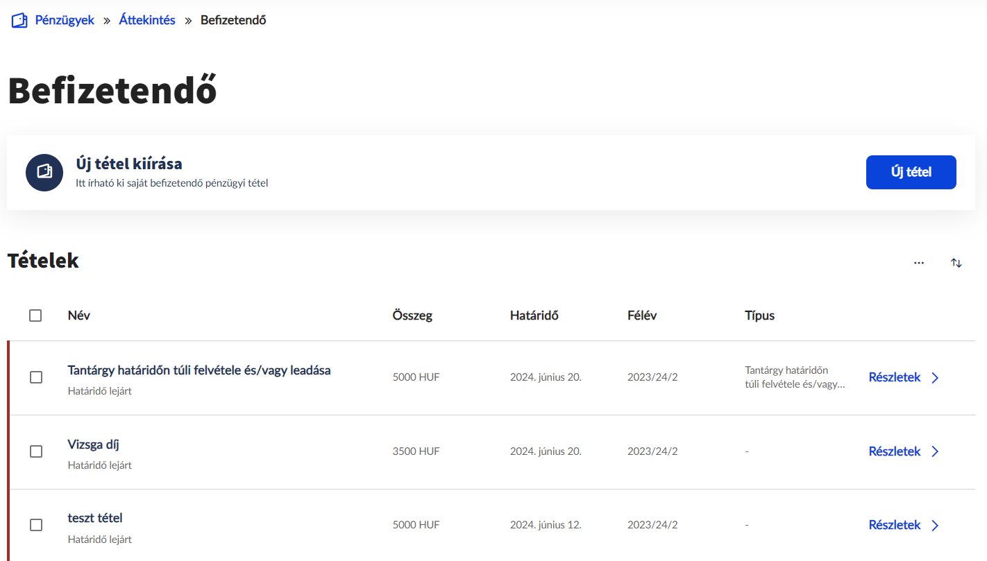 A hallgató által kiírt tételek befizetése a kiíráskor is indítható.
