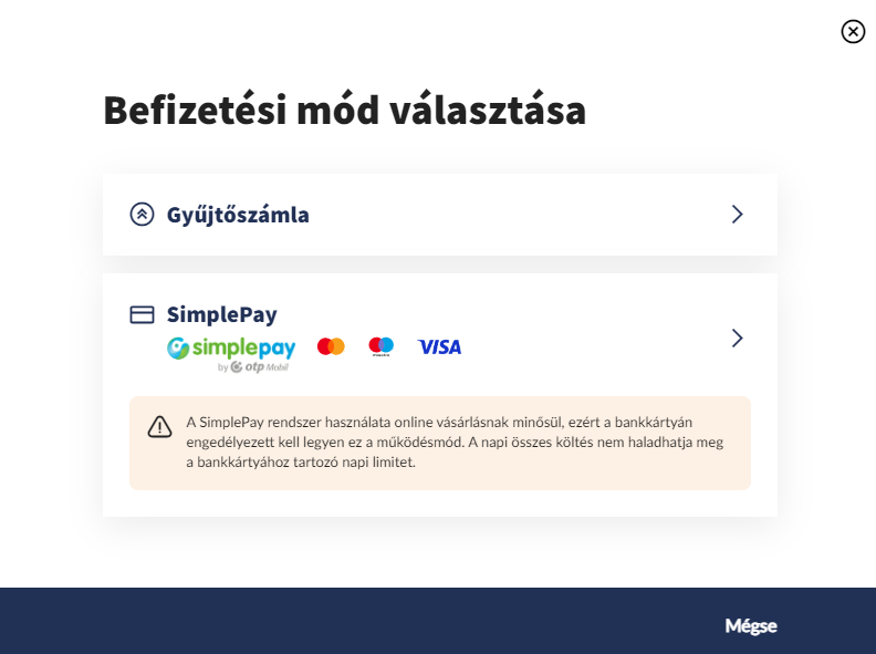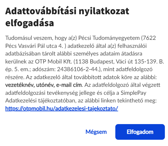 A bankkártyás fizetéskor az erre alkalmas bankkártya segítségével az OTP Bank Simple Pay weboldalán keresztül teljesíthető a befizetés. A Simple Pay befizetési módot alkalmazva a rendszer minden esetben kéri az Adattovábbítási nyilatkozat elfogadását. Az elfogadás hiányában a befizetés nem folytatható.