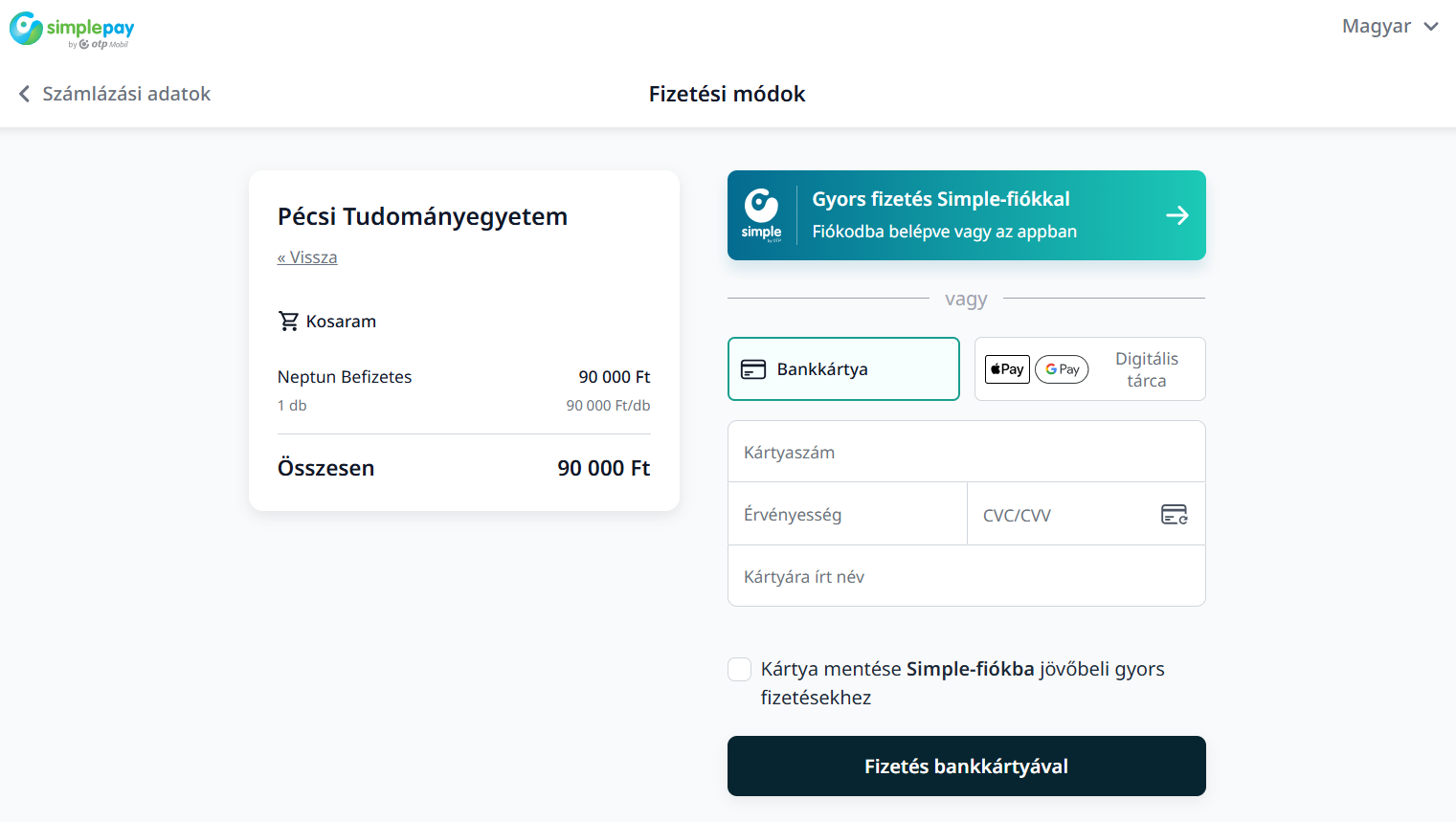 Ezután a Simple Pay weboldala jelenik meg, ahol a bankkártya adatainak megadásával az interneten keresztül teljesíthetőek a kiírt tételek. Amennyiben a befizető már regisztrált Simple Pay felhasználó, rendelkezik mobilalkalmazással, úgy a facebook, google, vagy a regisztrált e-mail címmel bejelentkezve a Simple-ben rögzített bankkártya adatok használatával is fizethet. A bejelentkezést követően a már rögzített, vagy újonnan felvitt kártyával indítható meg a fizetés. A gyűjtőszámlás befizetéshez hasonlóan a bankkártyával befizetett tételek teljesítésének regisztrálása azonnal megtörténik a Neptunban. A sikeres befizetésről visszajelző ablak tájékoztat.